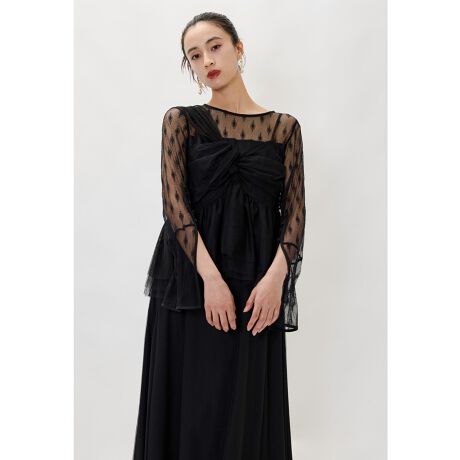 クラシカルな柄のレーストップスをドッキングした、チュール素材を重ねたワンピース。