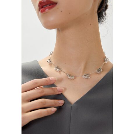 シンプルなスタイリングでも、胸元を華やかに引き立ててくれます。
