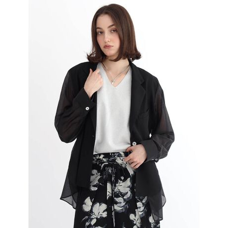 異素材の組み合わせから新たな雰囲気を生み出す新ジャケットスタイル。袖、身頃にシアー素材を取り入れ、夏の羽織りスタイルも軽やかで清涼感ある着こなしを叶えます。フロントバックともに違った風合いを醸し出し、ほのかな光沢がどこか上品かつ大人っぽさを感じさせます。日常の着こなしをグレードアップさせてくれる、おすすめの逸品です。