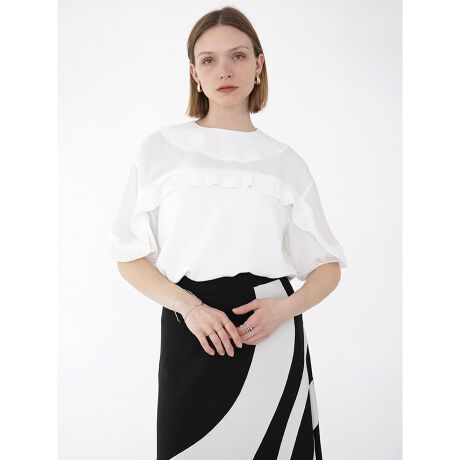 Agaロングセラーのプリーツフリルブラウスが春夏仕様のハーフスリーブデザインになって登場。肩からフロント、袖にかけてゆるやかに包み込むフリルがしなやかさを演出。フリルには細かなプリーツをあしらい可憐なデザイン性を加えながらも、すっきりとした首元で大人のバランスに。ボトムスを選ばずカジュアルからオケージョンスタイルまで幅広く活躍するアイテムです。