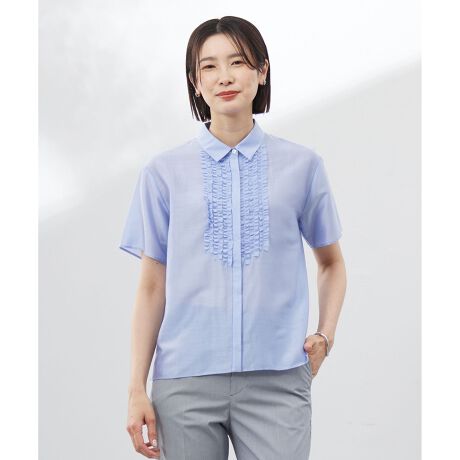■デザイン繊細なフリルがあしらわれた、甘さ控えめなブラウスライクカットソー。シャツ襟デザインが程よくキチンと感をプラスし、ノースリーブをインに仕込んで羽織ブラウスとしても、前を留めて1枚で着こなしてもサマになる汎用性の高さが魅力です。コンパクトなシルエットが上品な印象を与え、通勤スタイルにも馴染むアイテム。シンプルなパンツやスカートと好相性で、着回し力抜群です。
