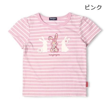 ラベンダーには小花柄のお花、ピンクには小花柄のうさぎのアップリケ。ガーリーなイメージの半袖Tシャツ。通園や通学にデイリーに着られるアイテム。【アイテム】トップス シンプル ガーリー フェミニン カジュアル お洒落 オシャレ かわいい 可愛い 普段着 デイリーウェア お出かけ着 お外着 お外遊び着 子ども こども 女児 女の子 ガールズ キッズ ベビーサイズ トドラーサイズ 幼稚園 保育園 小学校 通園 通学 小学生 2025年春夏物新作 丸高衣料 薄紫色 パープル ボーダー ウサギ フラワー ムージョンジョン りぼん リボン コットン100% 綿100%