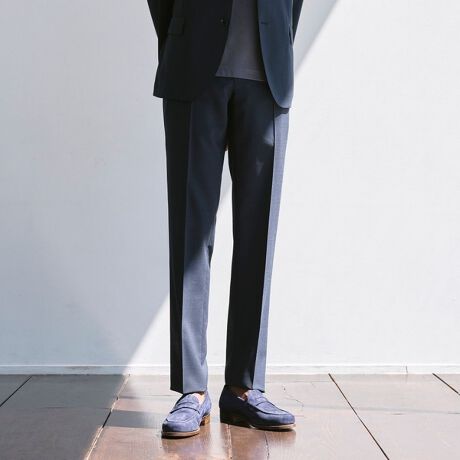 ブランドを代表するテーラードセットアップのNEWBRIDGEモデルにおける最軽量バージョンです。ポリエステルをブレンドしたウール素材はシワになり難く、ストレスを感じさせない軽い着心地です。汗ばむ季節のビジネスシーン、特に出張の多いジェットセッターには最適です。