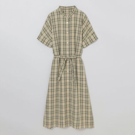 バンドカラーチェックワンピース。オリジナルチェック柄をリラックス感のあるドルマンスリーブのシャツワンピースデザインに落とし込みました。共地ベルト付き。