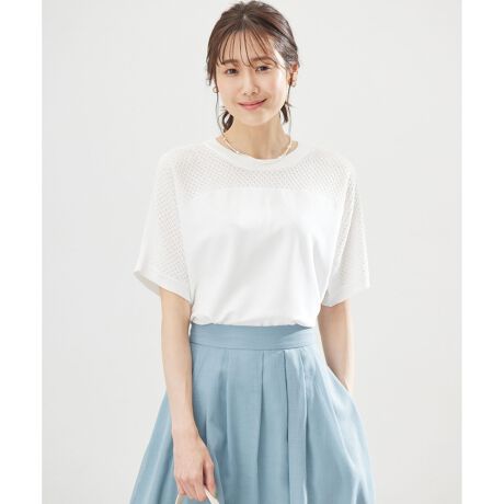 ■デザイン・メッシュの編地が涼しげな天竺と切り替えの5分袖ニット。・Tシャツのような袖口は通気性が良く着心地も抜群。・脇スリットの前後差があるのでスカートにもパンツにも着回し◎。