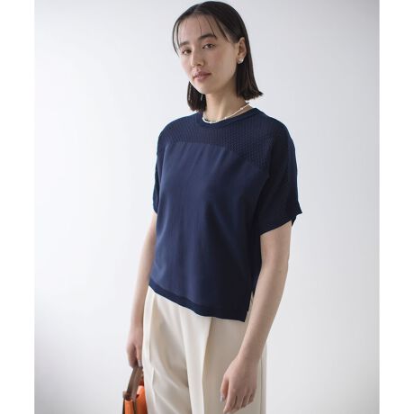 ■デザイン・メッシュの編地が涼しげな天竺と切り替えの5分袖ニット。・Tシャツのような袖口は通気性が良く着心地も抜群。・脇スリットの前後差があるのでスカートにもパンツにも着回し◎。