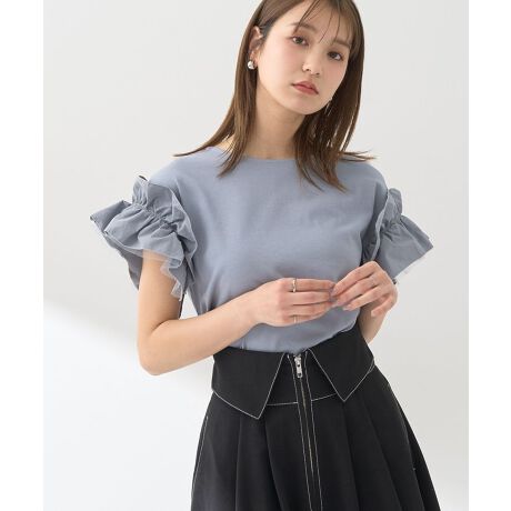 接触冷感性のある素材で仕立てたカットソー。フリル+チュールでボリュームを出した袖が気になる二の腕ラインも華奢に演出します。ご家庭で洗濯できるイージーケア仕様なのも嬉しいポイント。カジュアルからきれいめまで幅広いスタイリングに合わせやすく、デイリーに活躍するおすすめのアイテムです。
