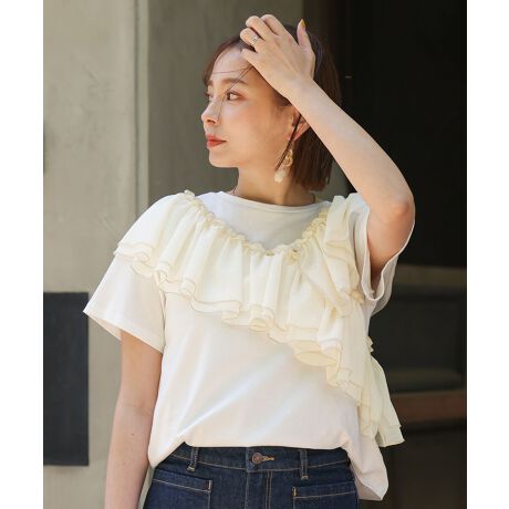 ボリュームのあるフリルがインパクトのあるTシャツはトレンド感もたっぷりで一枚スタイリングがお洒落に決まります!!