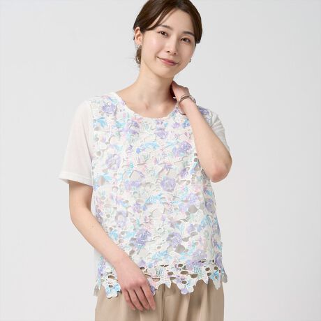 カジュアル使いにおすすめな明るい印象の花柄ブラウス。