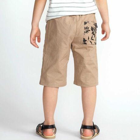 おしりポケットにポイント使いしたリーフ柄と麻のような生地が夏らしいハーフパンツ。