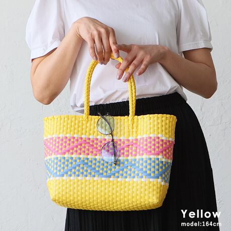 メキシコではマルシェ(お買い物)バッグを意味します。見た目もカラフルで可愛らしく、とても丈夫なのでガシガシ使える万能アイテムです。ポリプロピレン素材のテープを、ひとつひとつ手作りで作られたメキシコの手工芸品の楽しさ、美しさが魅力です。
