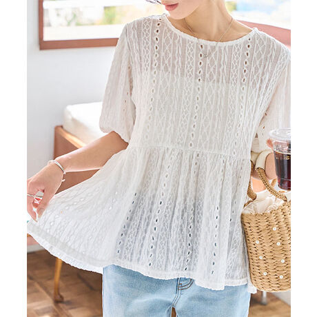 繊細なカットレースが目を惹く、涼しげで華やかなフレアトップス。