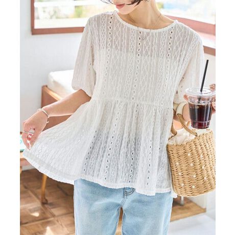繊細なカットレースが目を惹く、涼しげで華やかなフレアトップス。