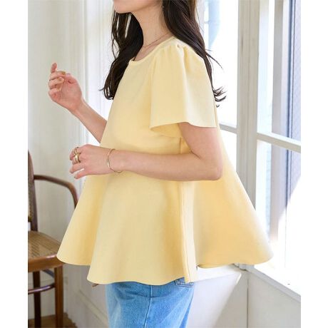ウエストから裾にかけてのペプラムラインと、肩にさりげなくボリュームを持たせたフレアスリーブが、リラックス感のあるナチュラルな女性らしさを引き立ててくれます。