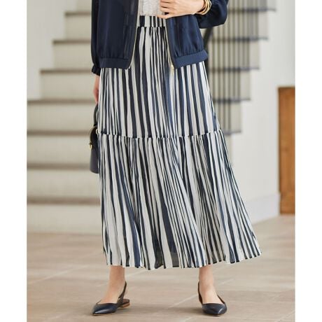 ストライプ柄が映える、軽やかでイージーケアなプリーツスカート■デザインウエスト総ゴムの1段ティアードのストライプ柄プリーツスカートです。ウエスト部分は細かいプリーツ、裾に向けて少し粗めのプリーツ加工を施すことで、よりフェミニンなシルエットになるように仕上げています。透けるような軽い素材とハンドワッシャーのプリーツ加工素材なので、アイロン要らずで取り扱いが簡単な点もポイントです。くるくる丸めて保管したり、旅行へ持っていく時にも丸めて持ち運べるのも便利です。清涼感と軽さが特徴のサップ裏地を使用しているため、暑い夏にも快適に着て頂けます。シンプルなトップスと合わせてコーディネートの主役になる着映えスカートです。■素材経糸にブライト糸、緯糸にスパン糸を使用しております。適度な透け感、ブライト糸の微光沢感、スパン糸の天然ライクな肌触りが特徴の、軽やかで接触冷感機能付きの素材です。裾に向かって緩やかに広がるハンドワッシャープリーツ加工を施しました。■同素材アイテム無地スカート(SKW7GM0510)