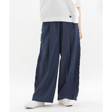 甘さと上品さを両立したトレンドパンツ。きれいめなデニムとやわらかいカジュアル素材で仕立てたフルレングスです。マニッシュなタックパンツでサイドのフリルが大人かわいいデザインポイント。ウエストはゴムで内紐付き。両サイドポケット付き。右後ろにスワンネームが付いています。