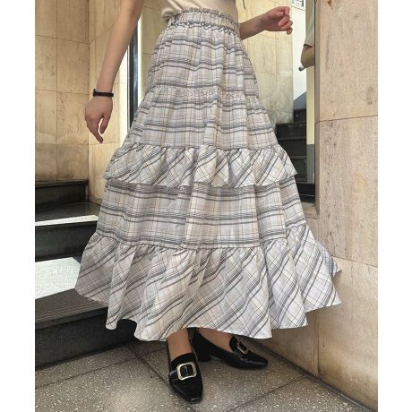 【セットアップ可能】【洗える】チェック ティアード ロング スカート
