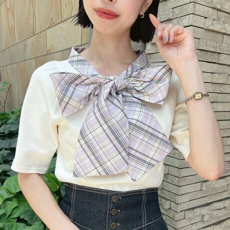 【セットアップ可能】【洗える】チェック リボン タイ カット トップス