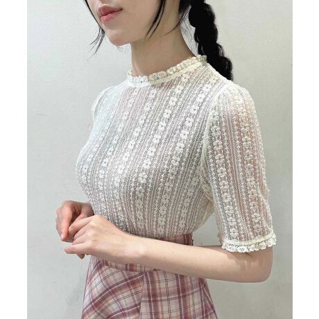 フラワーモチーフのストライプレースを使用したガーリーなトップス。