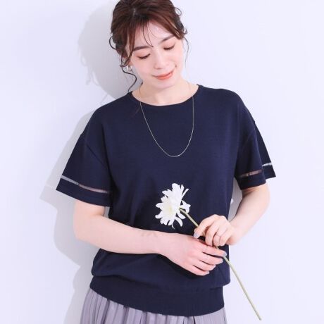 フレアスリーブが目を惹くデザインニットです。