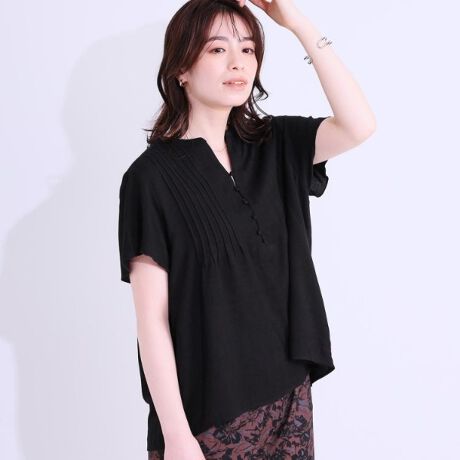 タック、ふわっとした袖デザイン、きれいに体型をカバーするシルエットがポイントです。