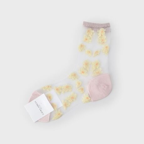 「シモーヌ」のお花柄を編み込んだ、繊細なテグス糸を使用した透け感あるシアーな靴下です。