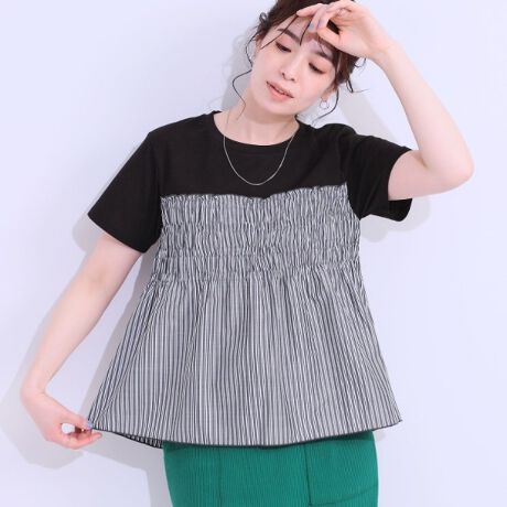 胸元切り替えで異素材を組み合わせたデザインTシャツです。