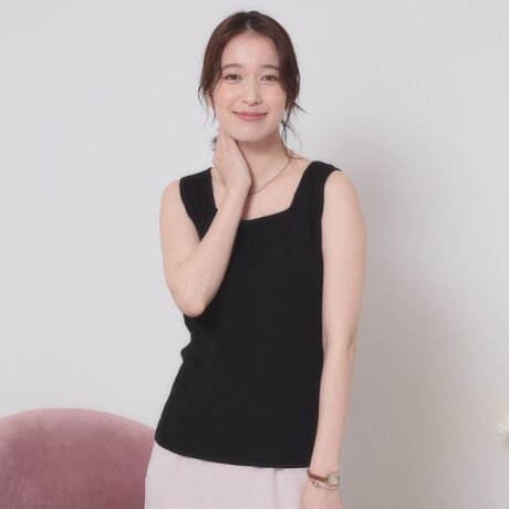 程よい開き具合のスクエアネックが着やすいニットタンクトップ。