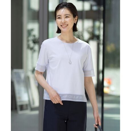 ■デザイン幾何柄のレースを袖口と裾にあしらった、シンプルかつトレンド感溢れるレースカットソー。ブランドらしい洗練された幾何柄が、甘すぎず大人の装いに上品なアクセントを添えてくれます。1枚で着ても華やかに、羽織のインナーとしても品よく決まる、着回し力の高いアイテムです。