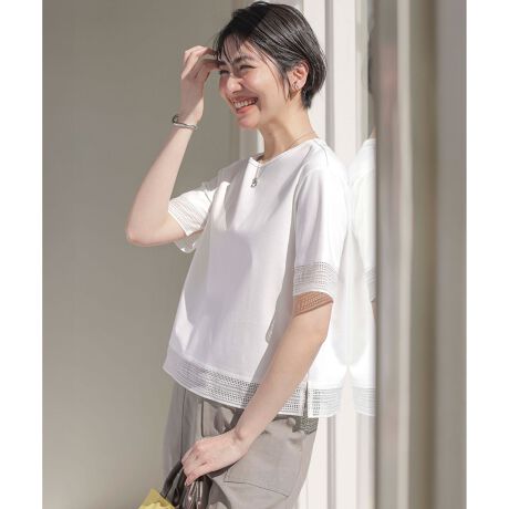 ■デザイン幾何柄のレースを袖口と裾にあしらった、シンプルかつトレンド感溢れるレースカットソー。ブランドらしい洗練された幾何柄が、甘すぎず大人の装いに上品なアクセントを添えてくれます。1枚で着ても華やかに、羽織のインナーとしても品よく決まる、着回し力の高いアイテムです。