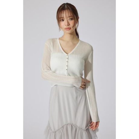 【シアーな編み地がポイントのニットカーディガントップス】■ポイント繊細な細い糸で編み上げたランダムリブのカーディガンニットトップス。フロントには立体的なボールメタル釦を細かい間隔で施しコンパクトな視覚効果を得られます。■ディテールセットインのコンパクトサイズで、シアーな編み地で表現した透け感が女性らしい印象に。お持ちのベアのインナートップスを一緒に着ていただくのがおすすめです。■スタイリング釦を開けてカーディガンとしても、釦を閉めてニットトップスにしても幅広いコーディネートが叶います。■生地透け感:なし裏 地:なし伸縮性:なし光沢感:なし厚 さ:薄手■商品のお気に入り登録お気に入りアイテムの再入荷・在庫1点などの通知を受け取ることができます。[注意事項]※画像の商品はサンプルです。実際の商品と仕様、加工が若干異なる場合があります。※画像の商品は光の照射や角度、お使いのモニター環境により、実物と色味が異なる場合がございます。※着用、お取り扱いの際は、アテンションタグをご確認ください。