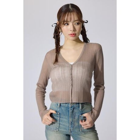 【シアーな編み地がポイントのニットカーディガントップス】■ポイント繊細な細い糸で編み上げたランダムリブのカーディガンニットトップス。フロントには立体的なボールメタル釦を細かい間隔で施しコンパクトな視覚効果を得られます。■ディテールセットインのコンパクトサイズで、シアーな編み地で表現した透け感が女性らしい印象に。お持ちのベアのインナートップスを一緒に着ていただくのがおすすめです。■スタイリング釦を開けてカーディガンとしても、釦を閉めてニットトップスにしても幅広いコーディネートが叶います。■生地透け感:なし裏 地:なし伸縮性:なし光沢感:なし厚 さ:薄手■商品のお気に入り登録お気に入りアイテムの再入荷・在庫1点などの通知を受け取ることができます。[注意事項]※画像の商品はサンプルです。実際の商品と仕様、加工が若干異なる場合があります。※画像の商品は光の照射や角度、お使いのモニター環境により、実物と色味が異なる場合がございます。※着用、お取り扱いの際は、アテンションタグをご確認ください。