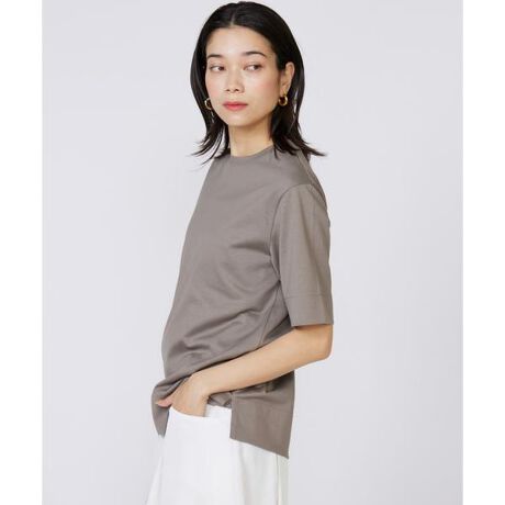■デザイン艶のあるコットン生地でお作りした、様々なシーンで活躍してくれるTシャツ。袖丈は程良い長さにしているので、腕を出したくないときにも重宝します。スタンダードなデザインですが、大人っぽく落ち着いた印象で着られる1着。鎖骨に沿うようにしたネックの開きは、首元をスッキリ見せてくれます。裾にスリットを入れることにより、腰ラインに抜け感もプラスしています。■素材シャツ素材に定評のあるイタリア アルビニ社で紡績した超長綿スーピマコットンをベースに、究極の着心地を求める日本のジャージーメーカーA-GIRL'Sで編みたてました。シワになりにくく、上品な光沢としなやかな肌触りが特徴です。後身頃は布帛生地切り替えで、デザインポイントになっています。UV加工と接触冷感、シワになりにくい素材を使用しています。・水洗い可■サンプル撮影商品■こちらの商品はサンプルでの撮影となっております。実際の商品とは、サイズや色味、素材、デザイン等の仕様が若干変更になる場合がございます。