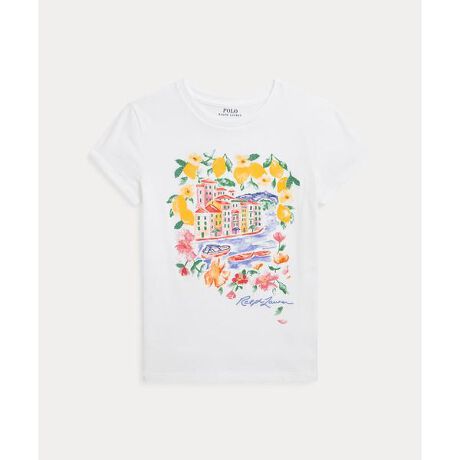 フラワーの刺繍に囲まれた、イタリアのリヴィエラの美しい絵画風の景色が特徴的なコットンジャージーのTシャツ。・クルーネック・キャップスリーブ・フロント中央にプリントしたイタリアのリヴィエラの景色、フラワーの刺繍、Ralph Laurenの文字※商品の色味は、光のあたり具合など諸条件により色感が多少異なって見える場合がございますので予めご了承下さい。 【素材】・本体:綿 100% 装飾部分を除く【生産国】カンボジア