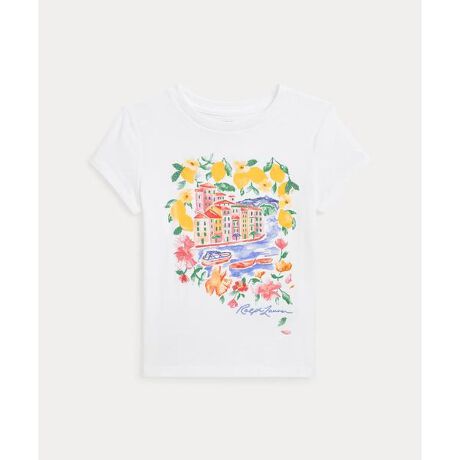 フラワーの刺繍に囲まれた、イタリアのリヴィエラの美しい絵画風の景色が特徴的なコットンジャージーのTシャツ。・クルーネック・キャップスリーブ・フロント中央にプリントしたイタリアのリヴィエラの景色、フラワーの刺繍、Ralph Laurenの文字※商品の色味は、光のあたり具合など諸条件により色感が多少異なって見える場合がございますので予めご了承下さい。 【素材】・本体:綿 100% 装飾部分を除く【生産国】カンボジア