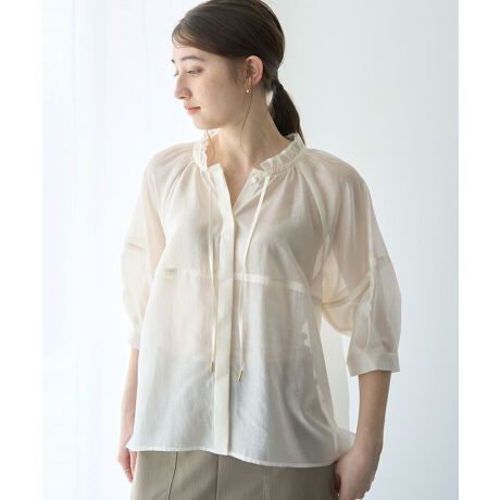 程よいふくらみのバルーンスリーブが華やかなシアーシャツ。