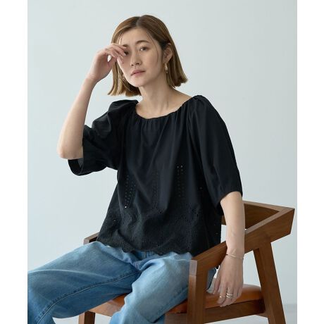 裾にはスカラップデザインを施し、フェミニンな印象を与えます。袖口のタックディテールで表現した丸みのある立体スリーブが気になる体型もカバーしてくれます。