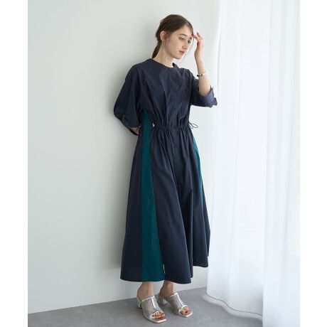 ハリのあるタイプライター素材で仕立てたデザインワンピース。配色使いやカフスのアシンメトリーディテールが目を惹くポイントです。ウエストドロストでシルエットのアレンジが出来るのも魅力的なポイント。高密コットン生地をバイオウォッシュでソフトに仕上げ、肌触りもよく快適にご着用いただけます。透け感[なし]