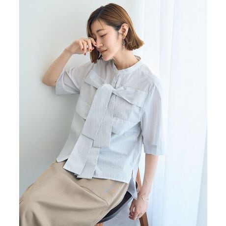 フロントのリボンディディールが目を惹くストライプシャツ。大人が着用しやすい、甘さを抑えたデザインです。ゆったりとしたオーバーシルエットながらも上品な雰囲気があり、肌触りのソフトな生地で快適な着用感も魅力的。前後差をつけたテールロングシルエットがスタイリングにこなれ感を演出してくれます。透け感[ややあり]
