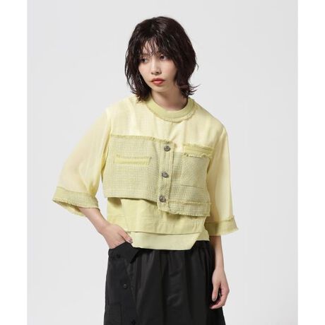 ツイードとシフォンと天竺カットソーのコンビネーショントップス。