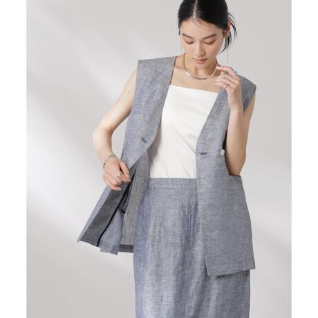 清涼感のあるリネン素材で仕立てたジレ。シャツやロンTとレイヤードしたり、ブラウス感覚で一枚で着たりとシーズンや気温に合わせてスタイリングを楽しめる一着です。