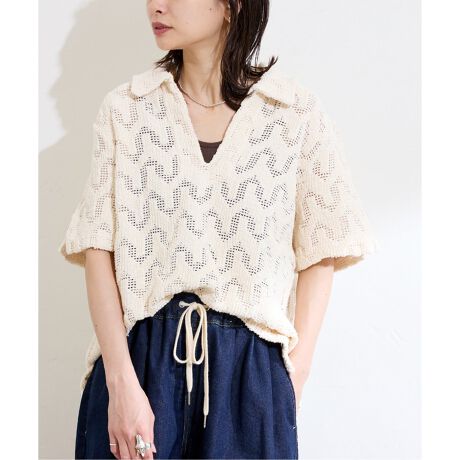 クロシェ編みで表現された幾何学的な波のパターンが涼し気な印象のブラウスはジャーナルスタンダードだけの別注アイテム。