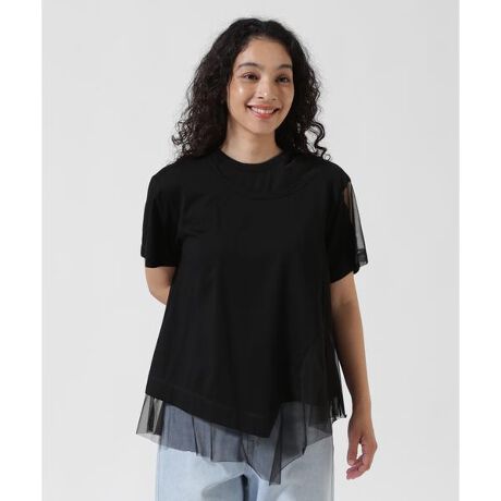 アシンメトリーのカッティングデザインが目を引くチュールコンビネーションTシャツ。