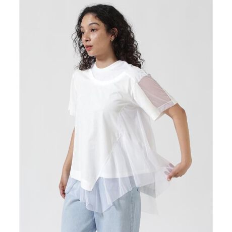 アシンメトリーのカッティングデザインが目を引くチュールコンビネーションTシャツ。