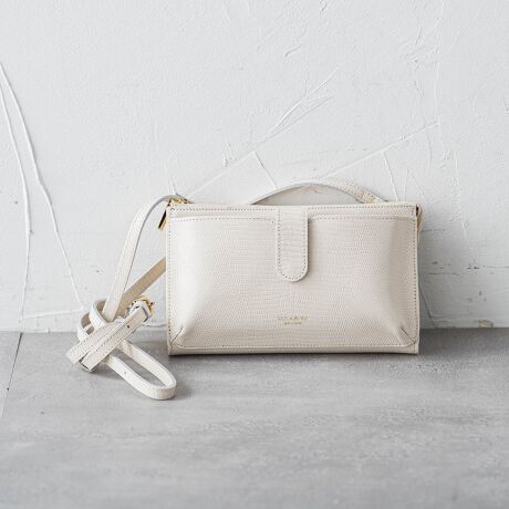 リザードの型押しレザーが女性らしい、横型のスマートフォンポシェット。