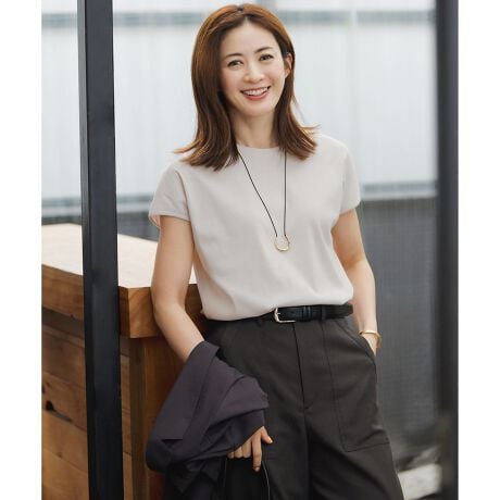 速乾性のある素材を使用し、暑い夏にも心地よく着られる人気のIT Tシャツ。ミニマルなクルーネックのフレンチスリーブTシャツです。気になる二の腕の一番太いところを絶妙にカバーしほっそり見せてくれる袖丈に仕上げ、身頃のフィット感もボディラインを拾わずシンプルながら使いやすいサイジングにこだわりました。身頃は裾に向かって細くしているので、裾をボトムにインしても、アウトでも程よくブラウジングさせてニュアンスある着こなしが楽しめます。カラーは、ベーシックなホワイト(#001)、ヘルシーなアプリコット(#022)、やわらかな雰囲気のベージュ(#033)、ニュアンス感のあるダークブラウン(#035)、爽やかなスカイブルー(#072)の5色展開です。