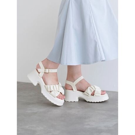 ふっくらとしたギャザーとクロスディテールがポイントになったサンダル。