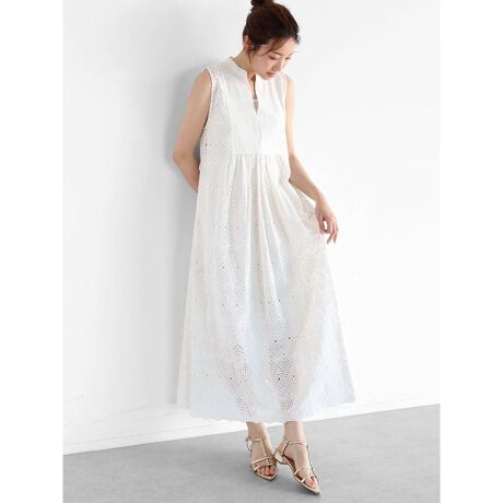 カットワークや裾のスカラップが映えるノースリーブワンピース。