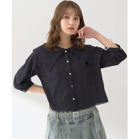 ポコポコとした刺繍生地がナチュラルな雰囲気のデザインブラウス。襟元にあしらったビッグカラーが顔まわりを華やかに演出します。短丈のややコンパクトフォルムで、様々なボトムと好相性。ワイドパンツやデニムを合わせた旬なミックスコーディネートもおすすめです。透け感[ややあり]
