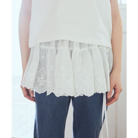 ナチュラルな雰囲気のエンブロイダリーレースで仕立てたラップスカート。たっぷりとギャザーを施したふんわりフォルムに、裾のスカラップデザインがフェミニンな印象です。カジュアルからきれいめまで、幅広いスタイルと着合わせしやすいのも嬉しいポイント。いつものボトムに重ねるだけで、スタイリングをぐっと格上げしてくれるおすすめのアイテムです。透け感[ややあり]